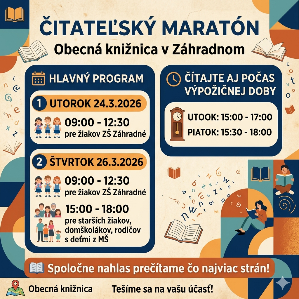 Pozývame všetkých milovníkov príbehov, malých aj veľkých čitateľov, zapojiť sa do nášho maratónu v čítaní! Príďte spolu s nami rozvibrovať knižnicu hlasným čítaním.