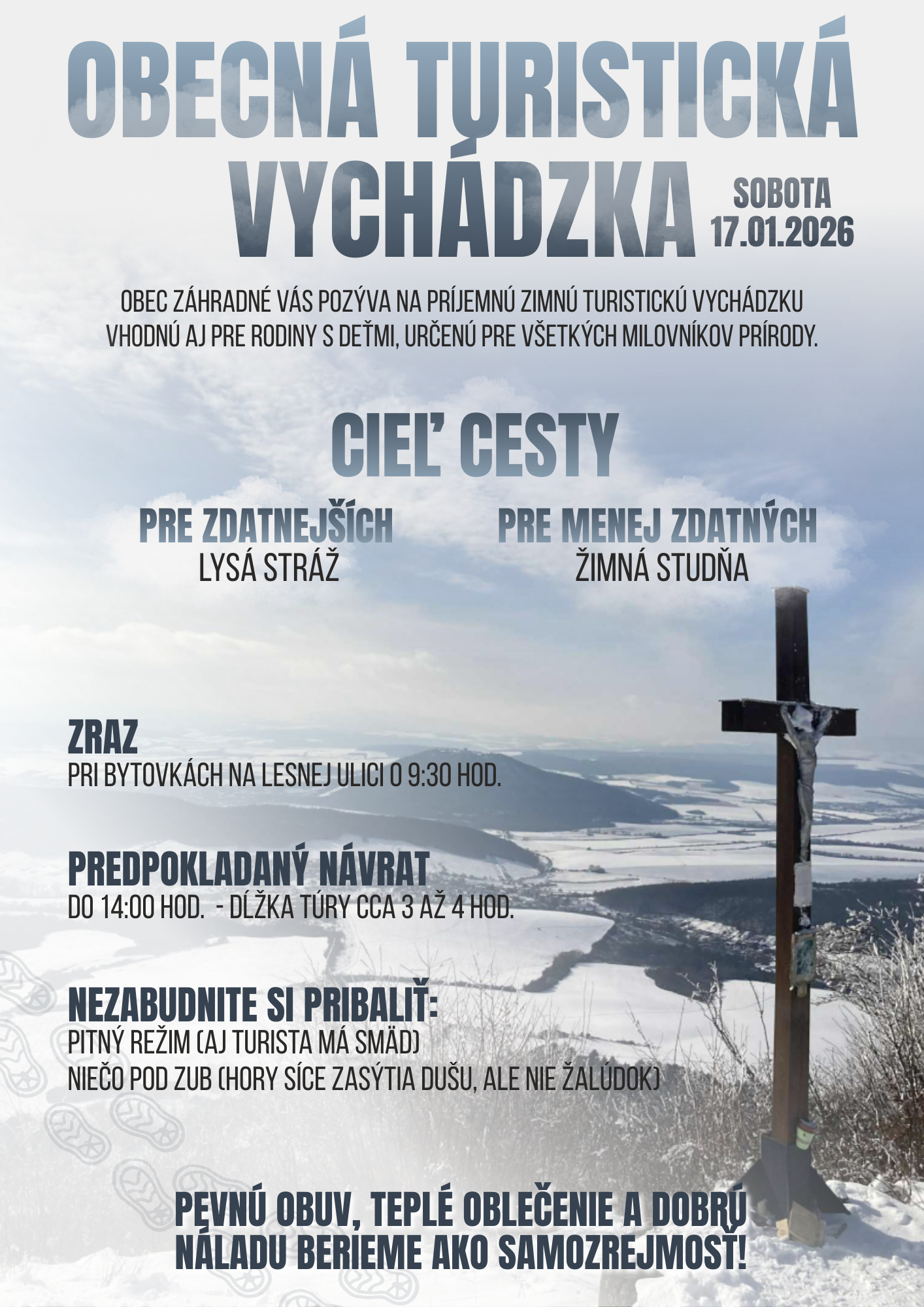 Obec Záhradné vás srdečne pozýva na príjemnú zimnú turistickú vychádzku, vhodnú aj pre rodiny s deťmi a všetkých milovníkov prírody.
