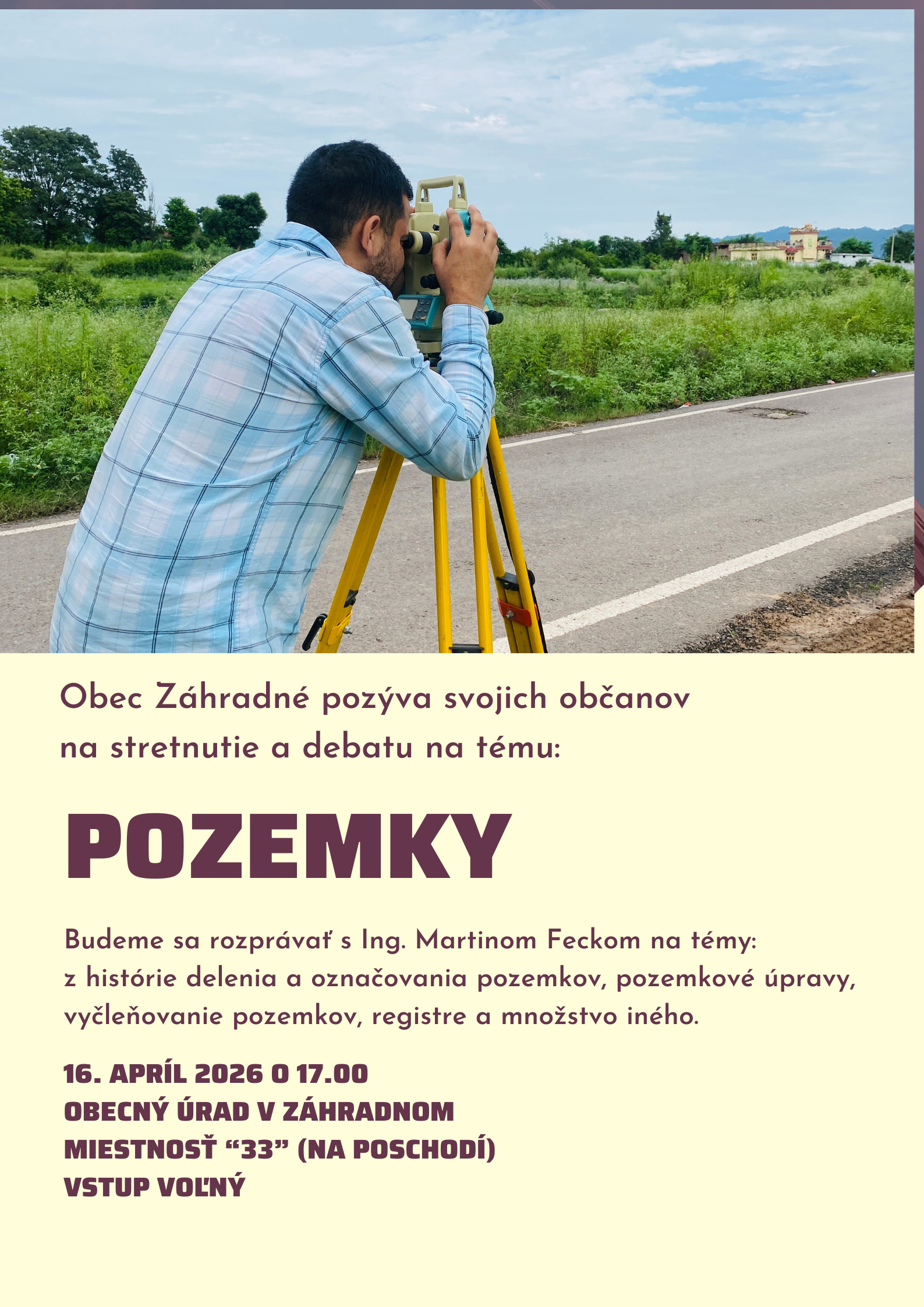 Obec Záhradné pozýva občanov na odbornú prednášku na tému Pozemky, ktorú bude viesť Ing. Martin Fecko. Hlavnými témami bude história označovania pozemkov, pozemkové úpravy, vyčleňovanie pozemkov, registre atď.